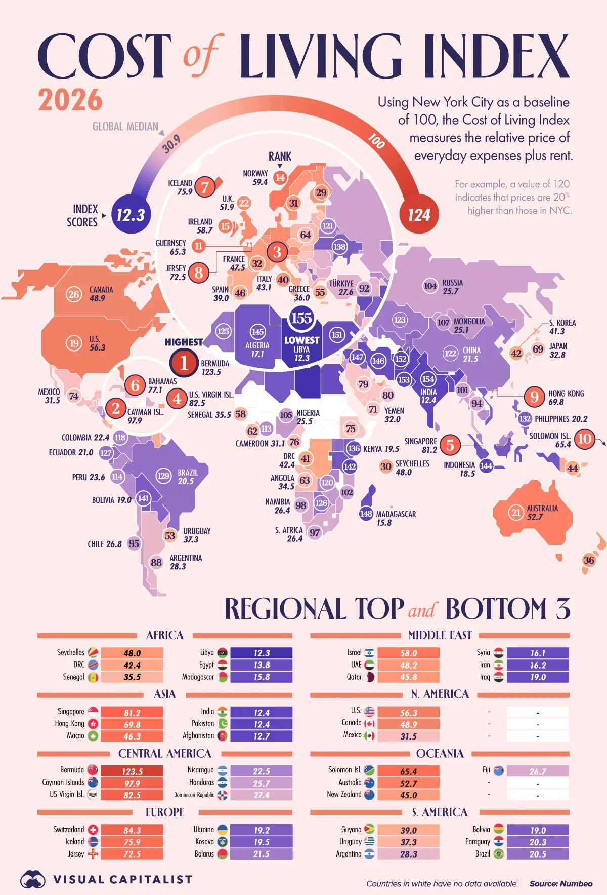 According to the Global Cost of Living Index 2026, Australia ranks in at 21 on the list. Bermuda, Cayman Islands and Switzerland round out the top 3, while the US ranks 19 and the UK at 22.